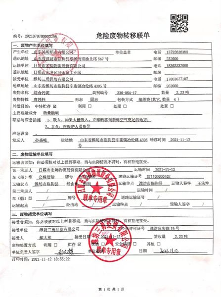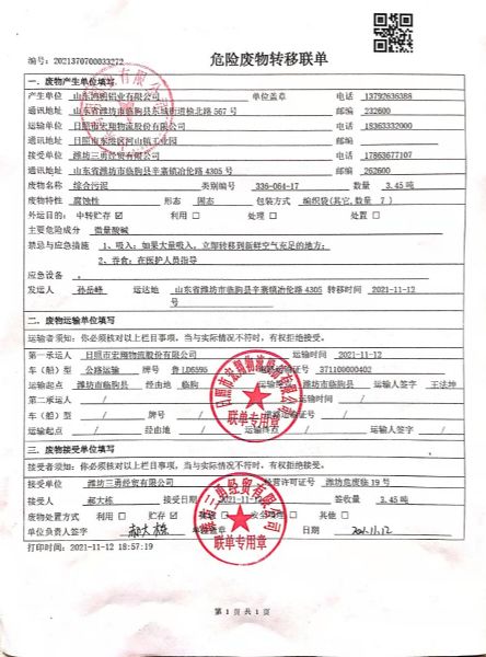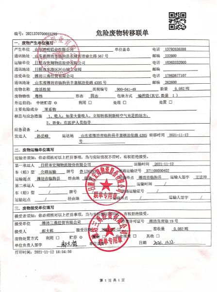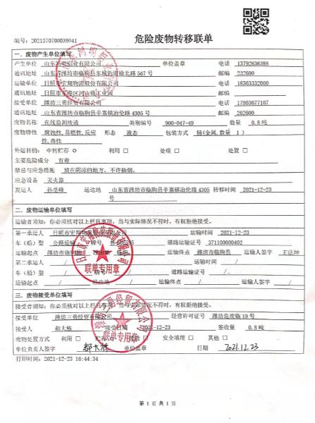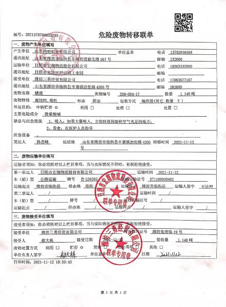公司2021年度與濰坊三勇經(jīng)貿(mào)有限公司簽訂危廢處理合同。2021年11月12日由日照市宏翔物流股份有限公司轉(zhuǎn)移運(yùn)輸。轉(zhuǎn)移綜合污泥5.68噸,廢活性炭0.082噸,槽渣1.148噸,在線監(jiān)測廢液0.8噸。合計轉(zhuǎn)移重量7.71噸。